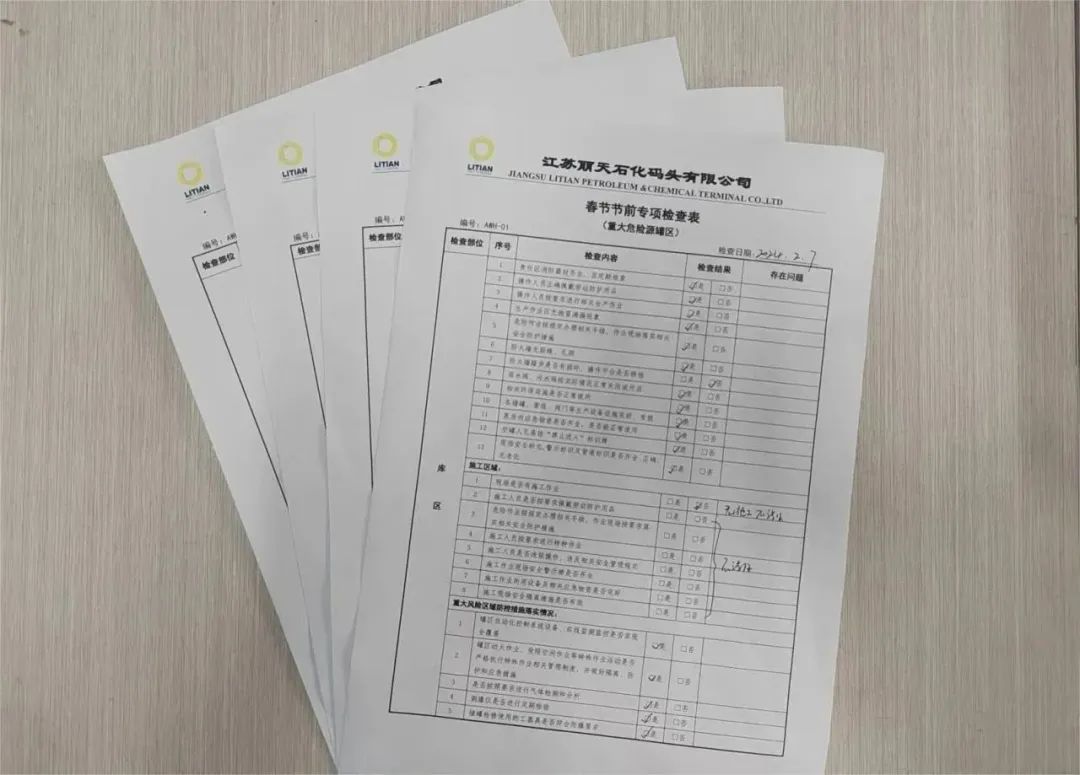 2月7日下午,麗天碼頭領(lǐng)導(dǎo)班子成員分別帶隊,組成5大安全檢查組迅速出動,直擊辦公區(qū)、儲罐區(qū)、公用工程、碼頭等區(qū)域,開展全覆蓋、無死角的地毯式安全隱患專項檢查。檢查期間,檢查組詳細(xì)了解節(jié)日值班值守、安全防范情況,以“邊排查、邊宣傳”的方式,再三叮囑各場所在崗人員要嚴(yán)格落實好相關(guān)安全防范措施,全力保障安全生產(chǎn)形式穩(wěn)定。