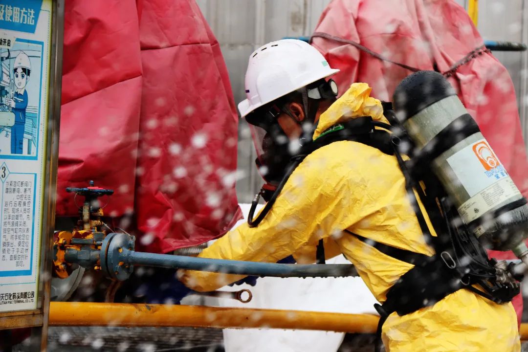 伴隨著對(duì)講機(jī)中傳來(lái)的急促呼喊,此次綜合應(yīng)急演練正式拉開了帷幕。演練模擬5506儲(chǔ)罐在卸貨過(guò)程中罐根軟管發(fā)生爆裂,大量苯乙烯泄漏并引起火災(zāi)、人員中毒等事故。
